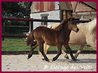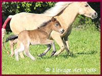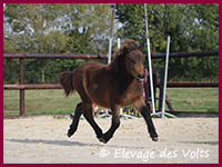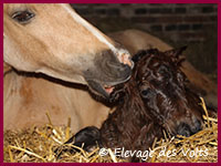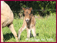 Sa mère, SONATE des BORDES, est une jument palomino de 106 cm, robe et taille que l’on trouve difficilement dans le shetland standard.